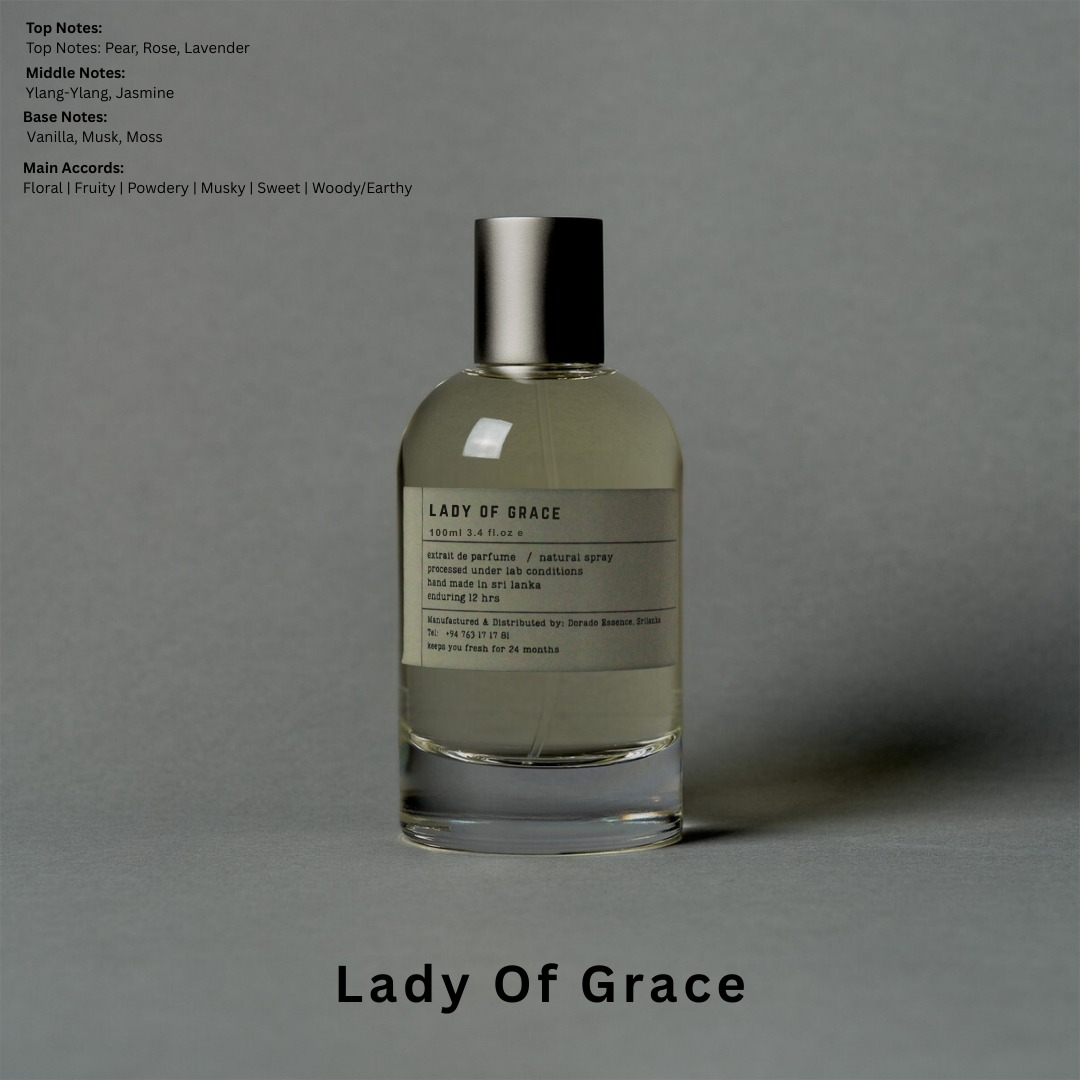 A gentle sparkle of pear, rose, and lavender opens with radiant freshness and soft femininity. At its heart, ylang-ylang and jasmine bloom gracefully, unveiling a floral harmony that is romantic, serene, and refined. Anchored by a delicate base of vanilla, musk, and moss, Lady of Grace lingers with warmth, purity, and timeless elegance—an ode to the beauty of grace itself.